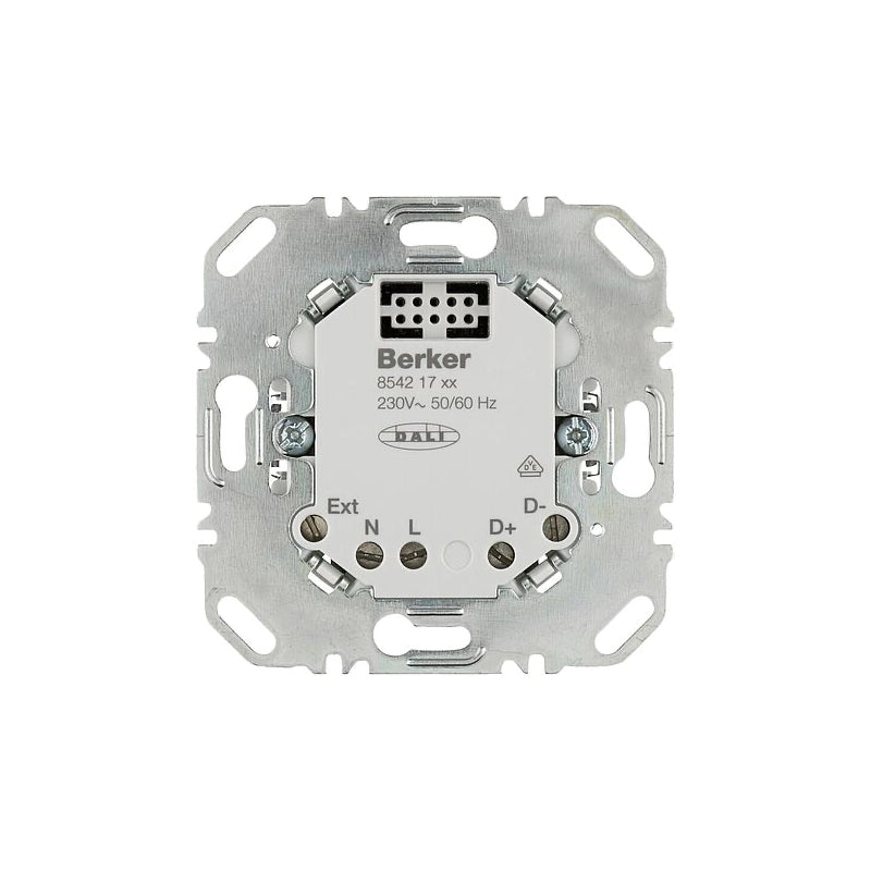 Der Berker DALI/DSI Steuereinsatz 85421700 ist ein Unterputz-Einsatzgerät für die DALI/DSI-Bus-Kommunikation im Broadcast-Modus gemäß IEC 62386-102. Er ermöglicht die Steuerung und das Schalten von elektronischen Vorschaltgeräten (EVG) und Tronic-Trafos mit DALI/DSI-Schnittstelle.