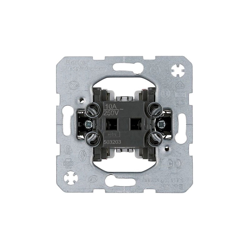 Der Berker 503203 ist ein Unterputz-Wipptaster mit einem Öffner- und einem Schließerkontakt, ausgestattet mit getrennten Eingangsklemmen. Er eignet sich ideal für Anwendungen, bei denen eine unabhängige Steuerung von zwei Leitungen erforderlich ist, beispielsweise in Beleuchtungs- oder Kontrollschaltungen.
